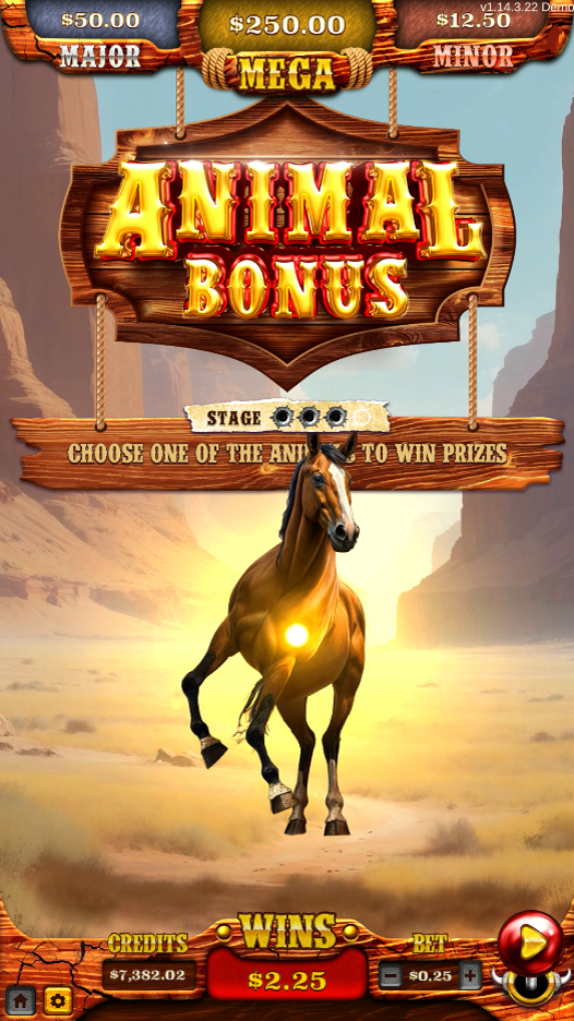 - Animal Bonus: This feature can be triggered randomly with a non-bonus line win. There are 4 rows of 4 animals presented to the player. Each animal contains a cash award. Additionally, the player may be upgraded to the next row and will be able to pick again.